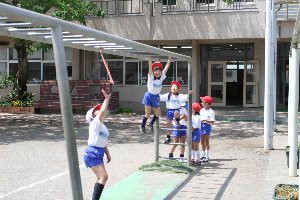 1年生のこのクラスでは、このプレイタイムを利用して、竹馬の練習をしたり、ロングうんていに挑戦しています。