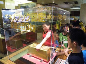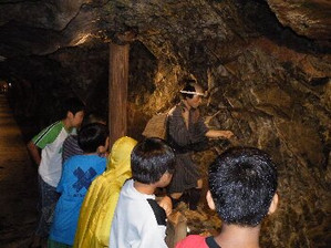 午後は、気温が下がり雨が降り出してしまいました。水泳の練習は、中止となってしまったため、土肥金山(http://www.toikinzan.com/)の見学に出かけました。昔の金山の採掘の様子をみたり、世界一大きい金塊に触ったりしました。