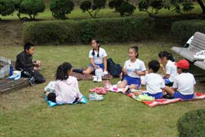 昼食は、グループごとにまとまり、フランス庭園の芝生でいただきました。