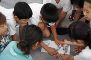 午後は、オリエンテーリングをして楽しみました。相模女子大学のキャンパスには、防空壕跡や文化財に指定された建物などがあります。小学部の子どもたちがガイドとなって剣崎小学校の子どもたちを案内しました。まず、コース探検地図がパズルになっているため、チームで協力して完成させました。完成したチームからスタートです。