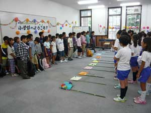 開会式は、小学部の子どもによる司会進行で進めました。歓迎の言葉を小学部4年生代表が述べた後、歌のプレゼントをしました。初めて会う子どもたちは、少し緊張した表情でした。