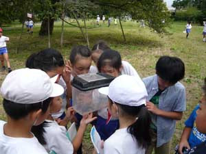 コースにはチャレンジポイントが4カ所あります。チャレンジポイントでは、「長なわ連続とび」、「先生とジャンケン勝ち抜き」、「虫とり」などグループで協力してゲームにチャレンジしました。百年桜のある野原では虫とりにチャレンジしました。トンボを素手で見事につかまえたりして、楽しく過ごしました。