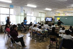 4年生社会科の公開授業教室では、4名の教員が授業を参観。