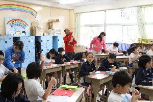 見学の先生方も子どもたちの中に入って、プリントに書かれたそれぞれの考えを確かめていました。