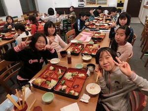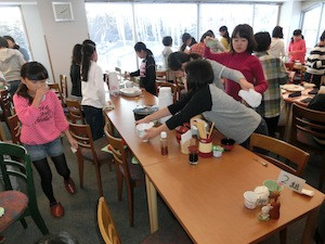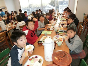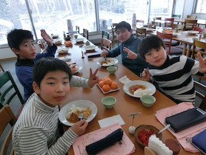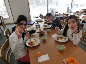1日中、しっかりスキーの練習をしたので、みんなお腹がぺこぺこです。体の疲れをとるためにも、しっかりと夕食をいただきます。