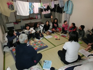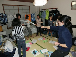 夕食後は、各チームに分かれてスキー練習のミーティングです。このチームは、ターンの姿勢をパンチに例えて体の動かし方を確認しています。