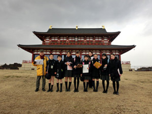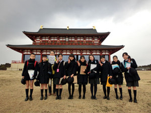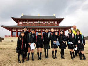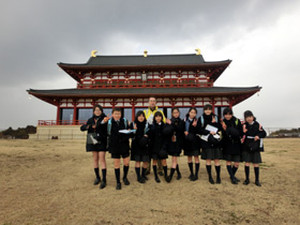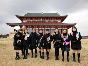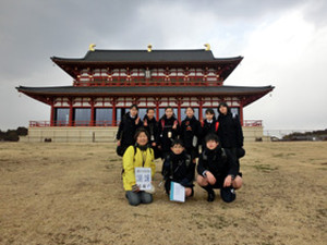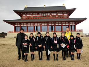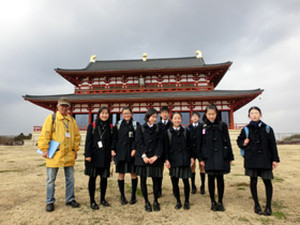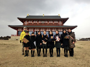 第一次大極殿院前で、班ごとにガイドさんを交えて記念写真を撮りました。中にも入り、見たこと、感じ取ったことを真剣に見学メモに残していました。