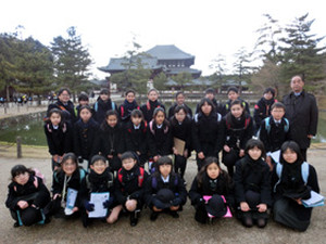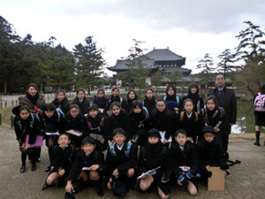平城宮跡の見学を終え、東大寺にやってきました。南大門で運慶・快慶作の金剛力士像を見た後、鏡池でクラスごとに集合写真をとりました。