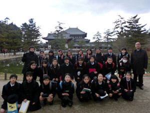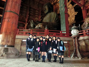 担任の先生も交えながら、盧舎那仏坐像と写真を撮りました。実際の大仏の大きさに圧倒されていました。