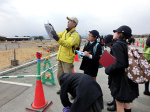 平城宮跡を目の前にして、どのように栄えていたのかをお話ししてくれています。昔の都だけあって、敷地の広さに驚いている子ども達もいました。