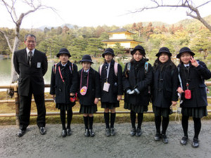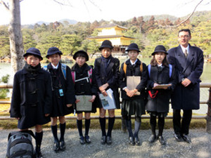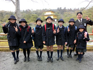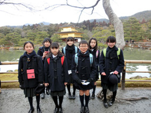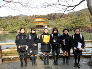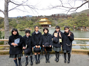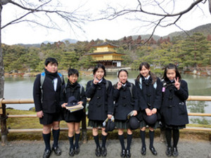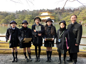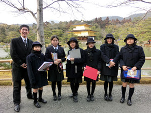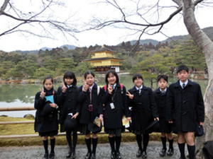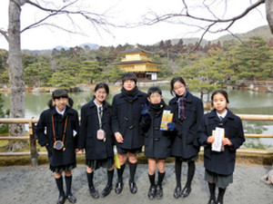 チェックポイントである金閣寺で、記念撮影をしました。晴れ間の中、雪がちらつくこともありました。始めに訪れた班はこれから先の見学に胸を躍らせ、途中で来た班は見学が充実したものになっていることを、話と表情で教えてくれました。