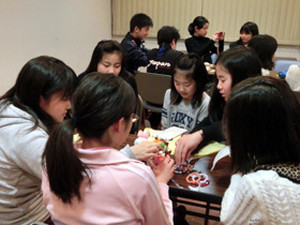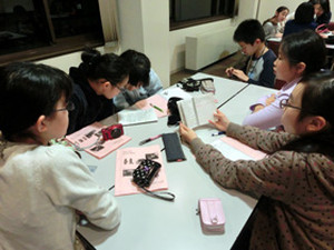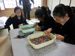 念珠の手作り体験をしています。制限時間内であれば、いくつ作っても良いそうです。終わるまでにいくつ作れるかな?