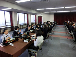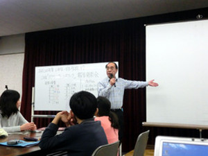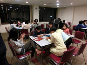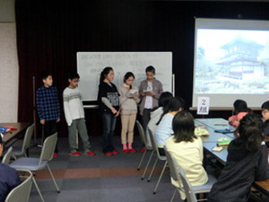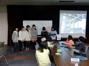 食事の後は報告会です。フィールドワークの班で発表前、最後の打ち合わせをしています。この班は、見学してわかったことをどう伝えるか話し合っています。