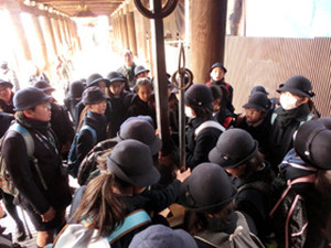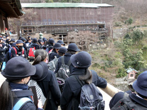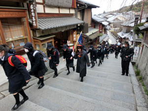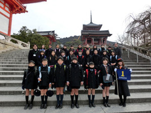 本堂の舞台といえば、「清水の舞台から飛び降りる」という言葉があります。舞台から下を見て、「高い・・・」「こんな所から飛び降りられない・・・」という声が聞こえてきました。この後、自由行動の時間をとり、京都の見学を無事に終えました。