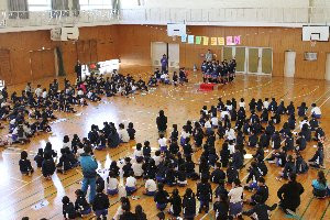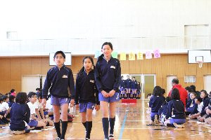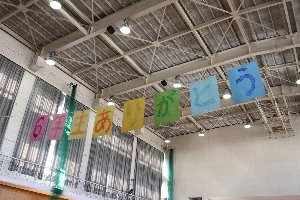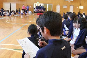 会場は体育館、1年生から5年生が各縦割り班に分かれて、6年生を迎えます。