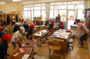 風が強いため、各教室で校長先生のお話をお聞ききし、準備体操をしてグランドに移動しました。
