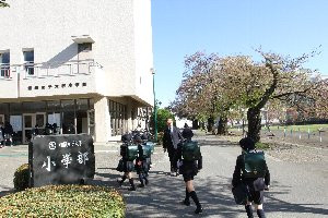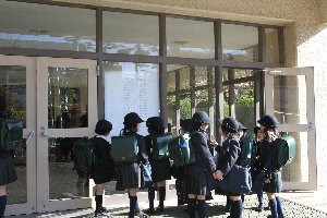 まず、玄関のドアに掲示された名簿で自分の所属学級を確認します。