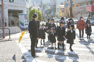 さっそく1年生を両手に引き連れた6年生が、歩道を渡ってきました。