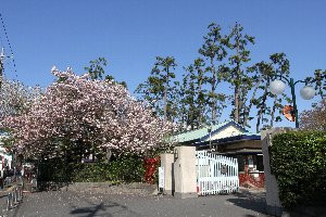 正門前の八重桜は今が見頃、青空に映えてとてもきれいです。