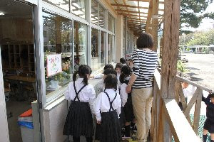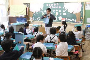 1年生が教室に到着すると、6年生がランドセルのしまい方など丁寧に教えてくれました。