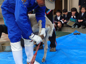 2013.04.242年生ミルクの爪切り小学部のマスコット ヤギのミルクの爪切りのため、獣医さんに来て頂きました。剪定(せんてい)ばさみで爪の長さを切りそろえた後、鎌形蹄刀(かまがたていとう)という刃物で形を整え、ヤスリで仕上げます。人間でいう人差し指と小指に当たるひづめ(少し高いところについている爪)は、剪鉗(せんかん)で切ります。子どもたちは、爪の切りはしに触ったり、臭いをかいだりして観察していました。「どの位のびるの?」など、たくさんの質問が出ました。