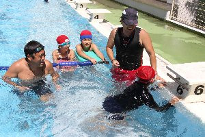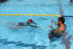 練習後半、赤帽の児童が25メートル(白帽)にチャレンジ!