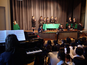 2013.12.12クラブ活動学校生活音楽クラブ クリスマスコンサート昼休みに視聴覚ホールで音楽クラブのクリスマスコンサートが開催されました。子どもたちは、やさしい音色に聴き入っていました。曲目 ハナミズキ ジングルベル ほか