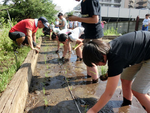 紐についた印を目安に、均等に苗を植えていきます。「ぬるぬるしてる」「あったか~い。」と、田んぼ独特の感触を楽しみながら田んぼ一杯に植えました。