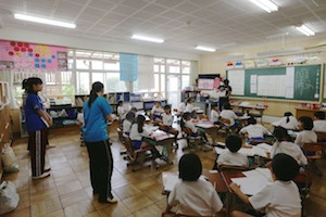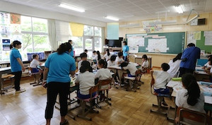 1年生は国語の授業です。教室の後方では、今週から教育実習に来ている子ども教育学科の学生が見学中。