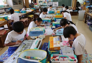 4年生の教室では、グループごとに床に座って、何やら楽しそうです。