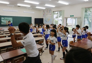 2年生の体育はホールで行われていました。運動会全校演技の踊りを交代で踊ってチェックを受けているようです。