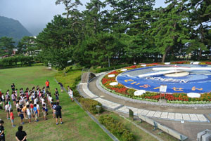 ギネスブックにも載る世界一大きな花時計の横で朝の会です。