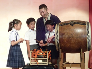 2014.10.094年生体験学習授業紹介4年生 つなぐ手 落語「つなぐ手」の授業に落語芸術協会の春雨や雷太(はるさめやらいた)さんをお招きし日本の伝統的な話芸である「落語」を体験しました。(写真は、お囃子の太鼓を子ども達が体験する様子)