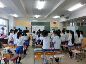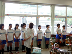 6年生のつなぐ手の授業で、劇団四季の俳優さん達を講師にお招きし、「美しい日本語講座」の授業をしていただきました。講師の先生方が話し始めると、その明瞭で迫力ある話し方に思わず「すごい・・・」という声があがりました。01