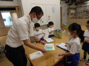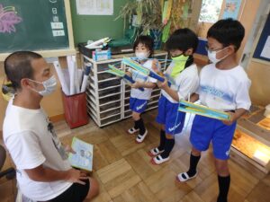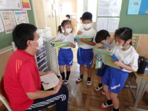 どの子も緊張した面持ちでしたが、しっかりインタビューしていました。そして、先生の似顔絵を描いたカードを渡しました。心を込めて描いた似顔絵付きのカードを先生たちもうれしそうに受け取っていました。