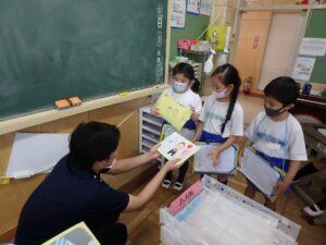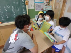 まず、お名前を聞くときには、自己紹介をしよう。それから、その先生の事を教えてもらおう。名前のほかにも質問しようということにしました。早速、質問項目を考え、1年生は、インタビューにでかけきました。