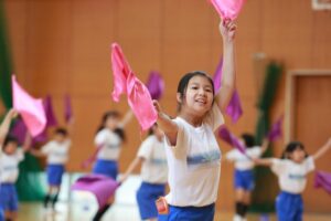5月の運動会中止でできなくなった全校演技ですが、全校演技の経験だけは全児童にさせたいと考え、5月のオンライン授業から踊りの映像を配信し練習がスタート。猛暑の中の練習もありましたが、子どもたちは熱心に練習を重ねて本番を迎えました。
