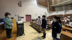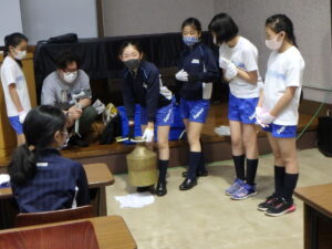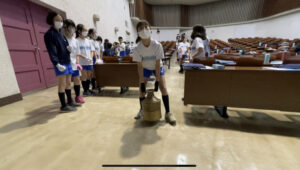 実際の水瓶を使って、水を運ぶ体験をさせていただきました。水を入れると約15㎏にもなる水瓶。子どもたちは室内の2mくらいを運びました。持ち上げるのにも気合いが必要で「あ~重い!」と言いながら、どうにか運んでいました。世界の子どもたちはそれを何㎞も、そして何往復も担いで運んでいるのです。私たちが蛇口をひねればきれいな水をいつでも飲むことができることは、決して当たり前のことではないことに、改めて気づきました。