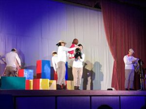 演目は、斉藤 洋さん原作の人気児童文学作品である『ルドルフとイッパイアッテナ』でした。舞台にある大道具といえば、カラフルな大小の直方体と立方体の複数のキューブ。劇団の方の手によって変幻自在に動かされるキューブによって、いろいろな場面が作り出されます。