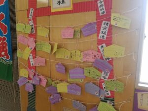5年生の廊下には。相模神社が登場。子どもたちがおみくじを引いて楽しんだり、今年の抱負を絵馬に書いて飾るなどしていました。
