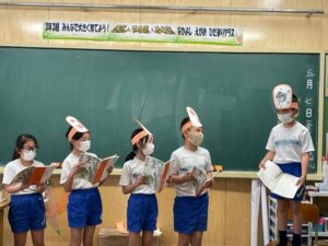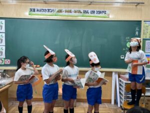2の場面では、きつつきが思いついた特別メニューである雨の音を想像しながら、ぶなの木の生えた深い森の世界を楽しんで読み進めました。そして5チームに分かれて、読み取ったことを生かして音読発表会をしました。自分の役と雨の音の読む速さ(ゆっくり、速く)、強弱、声の大小、声の高さ低さなどを工夫して、音読をしていました。