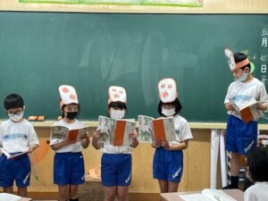 最後に、森の素晴らしさを伝えるために、お客さんを喜ばせるために「おとや」を開いているきつつきを中心人物に、一人ひとりがオリジナルの3の場面を作りました。場所、季節、時間帯、お客さんの設定から考えていきます。先日遠足で訪れた高尾山をお話の舞台にする子もいて、25通りのすてきな3の場面のお話が出来上がりました。