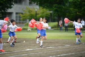 初めてのリレーチャレンジ。バトンパスの難しさを感じながら頑張った 4年生学年色別リレー