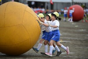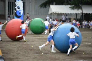 大きな大玉に悪戦苦闘 2年生大玉ころがし