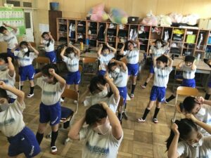 当日は、黒板に飾り会社が作った輪飾りが飾られ、生き物会社による電子黒板を使ったクイズを皆で楽しみ、そして、全校演技の踊りもプログラムに組み込まれていました。運動会本番の動画に合わせて、子どもたちは踊りだしました。心から楽しんで踊っている姿が本当に愛おしかったです。
