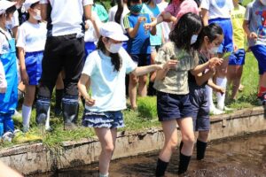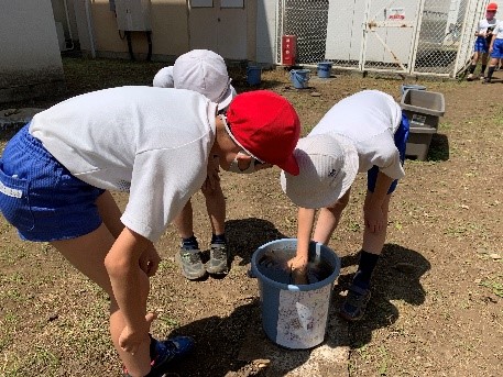 一言で「植える」といっても、水の張ってある田んぼに上手に植えるのはなかなか難しく、植える位置の印があってもうまくその位置に植えられなかったり、しっかりと植えられなかった苗が流れていってしまったり・・・そしてなにより暑い中での作業はとても大変でした。「農家の人は、大変だね。」と、作業中、子どもたちがつぶやいていました。子どもたちは作業を通して、しっかりと学ぶことができました。