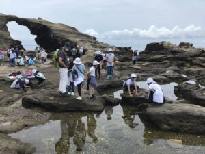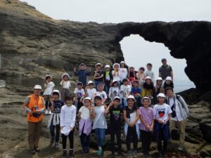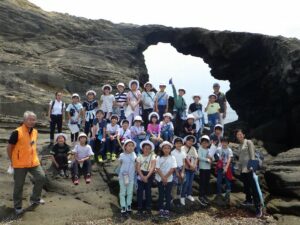 ここでは、島の成り立ちについてや、地層のこと、市の鳥でもあるウミウについての話をしていただきました。また、城ヶ島公園の観光名所「馬の背洞門」を実際に見て、どのようにできたかも教わりました。