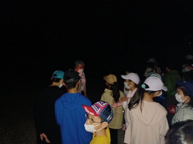 夕食後は、本日最後のメニュー。夜の青木ヶ原樹海のヒメネズミ見に行くツアーです。富士山エコネットの方のご指導で、夜の森に静かに入ります。おしゃべり禁止。森の中で迷わないように列になって、お友達の背中に手をかけながら森に入ります。