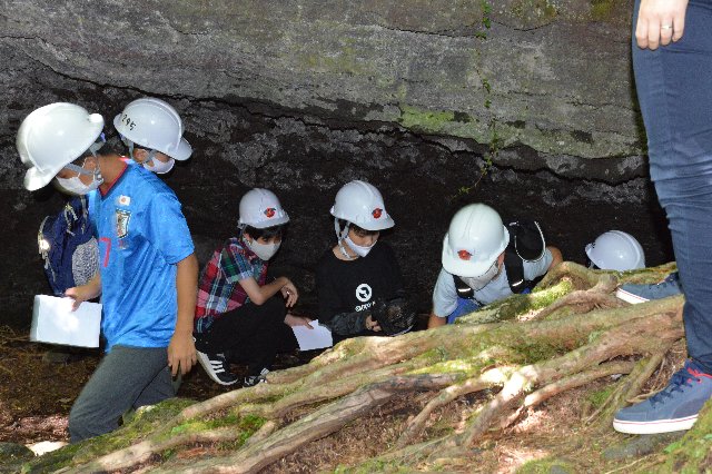 コウモリ穴に入る前の青木ヶ原樹海には、洞窟ほかにも厚い溶岩や溶岩ドームなどを見学することができます。子どもたちはドームに入ったり、説明書きを読んだり、先生の説明を聞いたりしながら学びました。