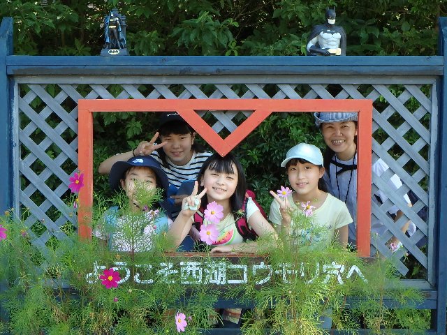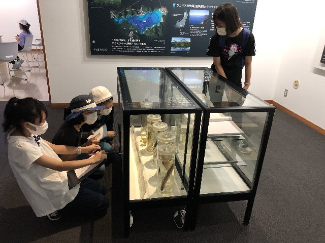 コウモリ穴の施設には、展示施設もあり、コウモリや西湖のクニマスの展示などもみて学習しました。